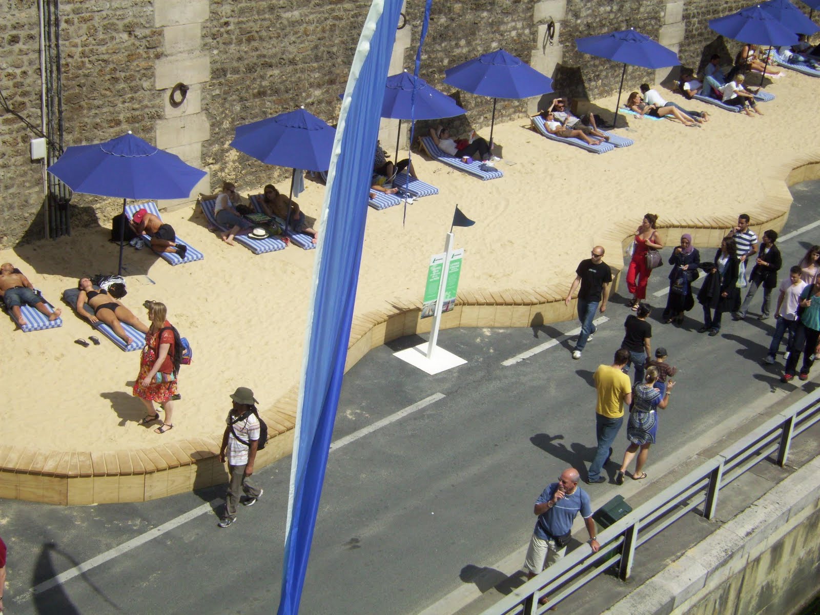 Pois errou quem pensava (como eu) que Paris não tem praia! A praia é "montada" mesmo às margens do Sena e duram esse ano pelo período de 21 de julho a 21 de agosto. Sempre há muita animação e turistas mais vermelhos que tomates por lá. Aliás, não é só lá que se consegue pegar um bronzeado (ou ensolação/escaldão). Qualquer parque há muitas pessoas de biquíni, shorts e afins a tomarem sol sem o menor problema.